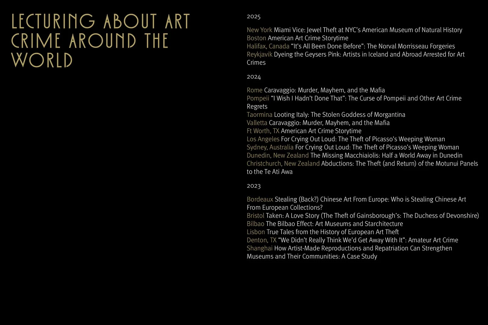 The speaking page carries the same principle. Listed by year and city, each entry pairs a location with a lecture title drawn from a local art crime: Caravaggio: Murder, Mayhem, and the Mafia in Rome, Missing: The Theft of The Mona Lisa in Paris, Losing Their Marbles? in London. The page reads like an itinerary and a bibliography at once.