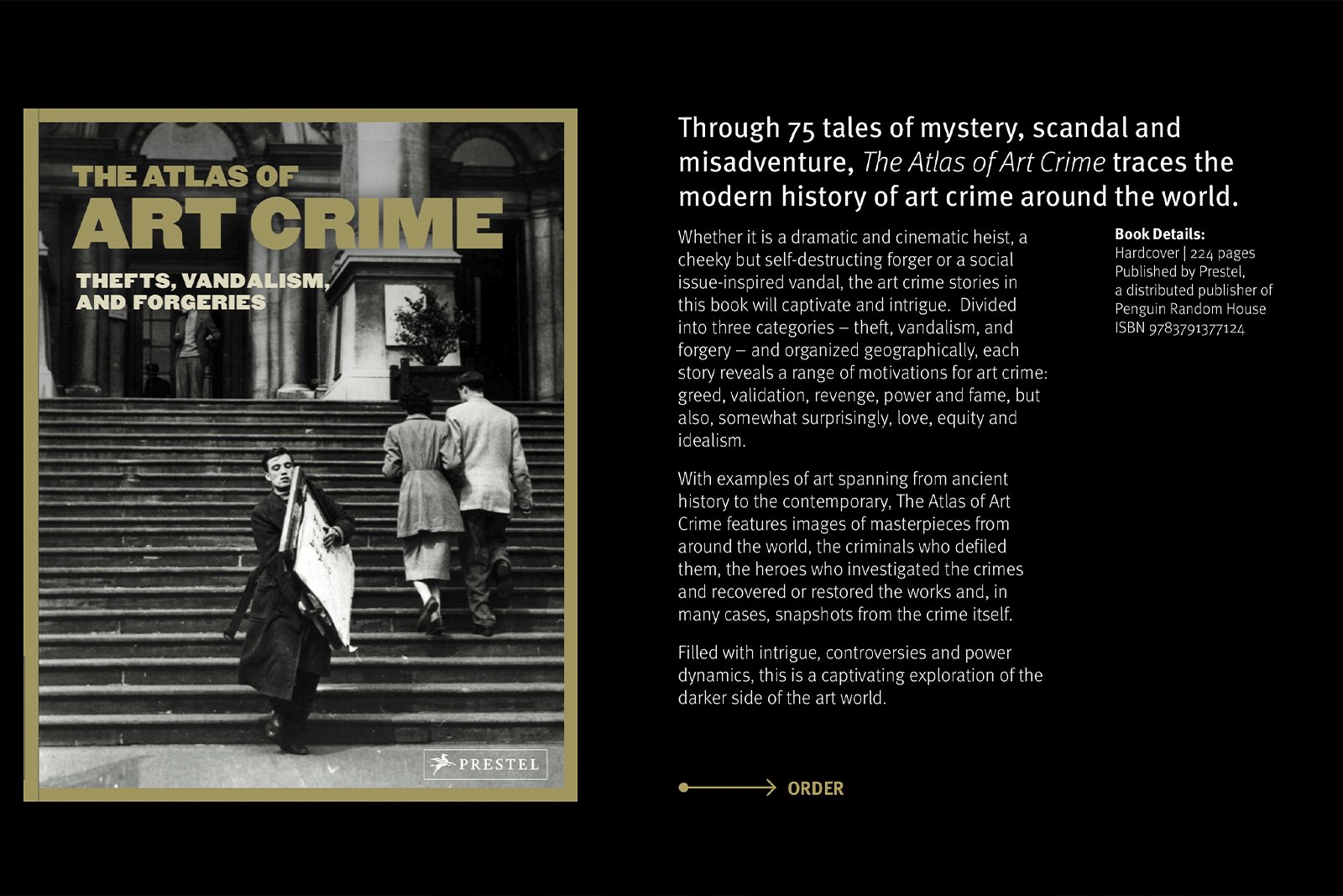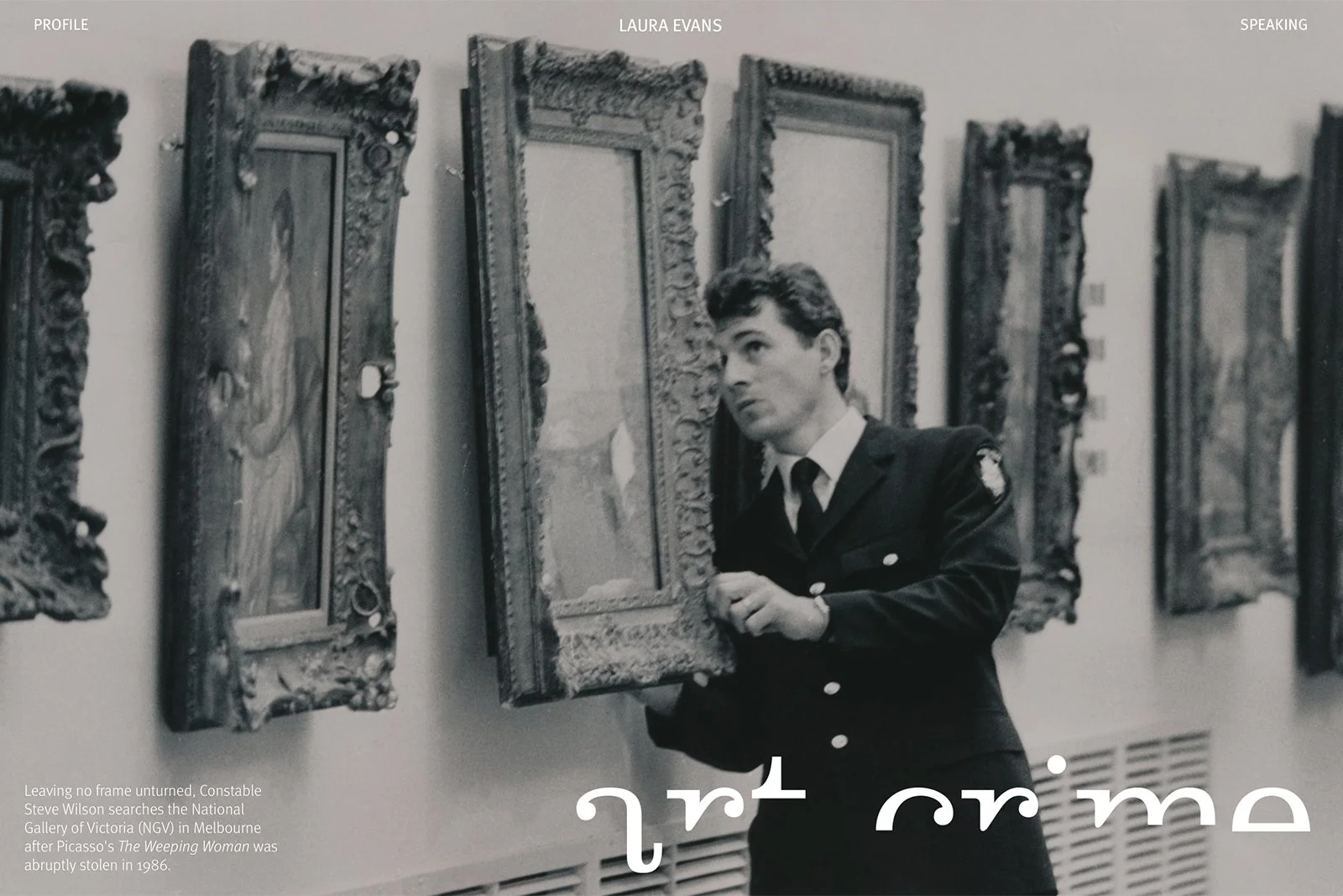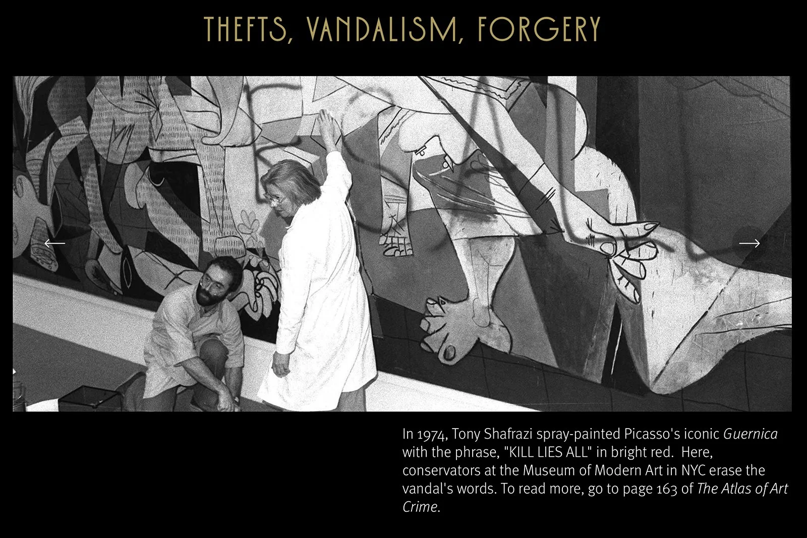 We read the book. The crime scene photographs, the courtroom portraits, the reproductions of slashed and stolen masterpieces were the site's raw material. We made the site an environment of the subject itself. Visitors encounter art crime stories directly on the homepage: a constable at the National Gallery of Victoria after the theft of Picasso's Weeping Woman, conservators at work on Guernica, the slashed Rokeby Venus. The book's content surfaces throughout. Page references point readers deeper into the volume.