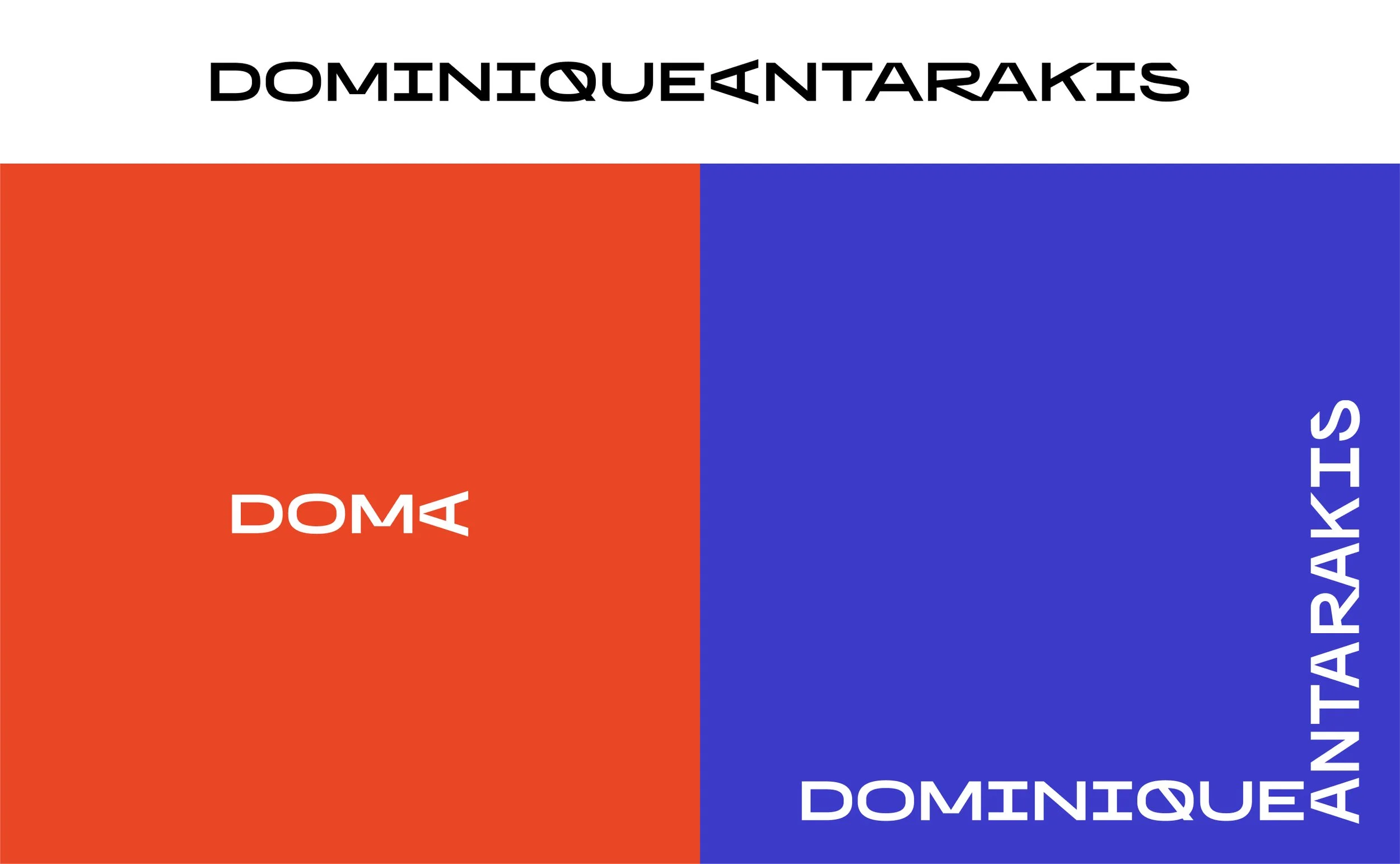 The logo works in three versions: the short DOMA mark, the full name running horizontal, and a corner lockup where DOMINIQUE runs along one axis while ANTARAKIS runs along the other.
