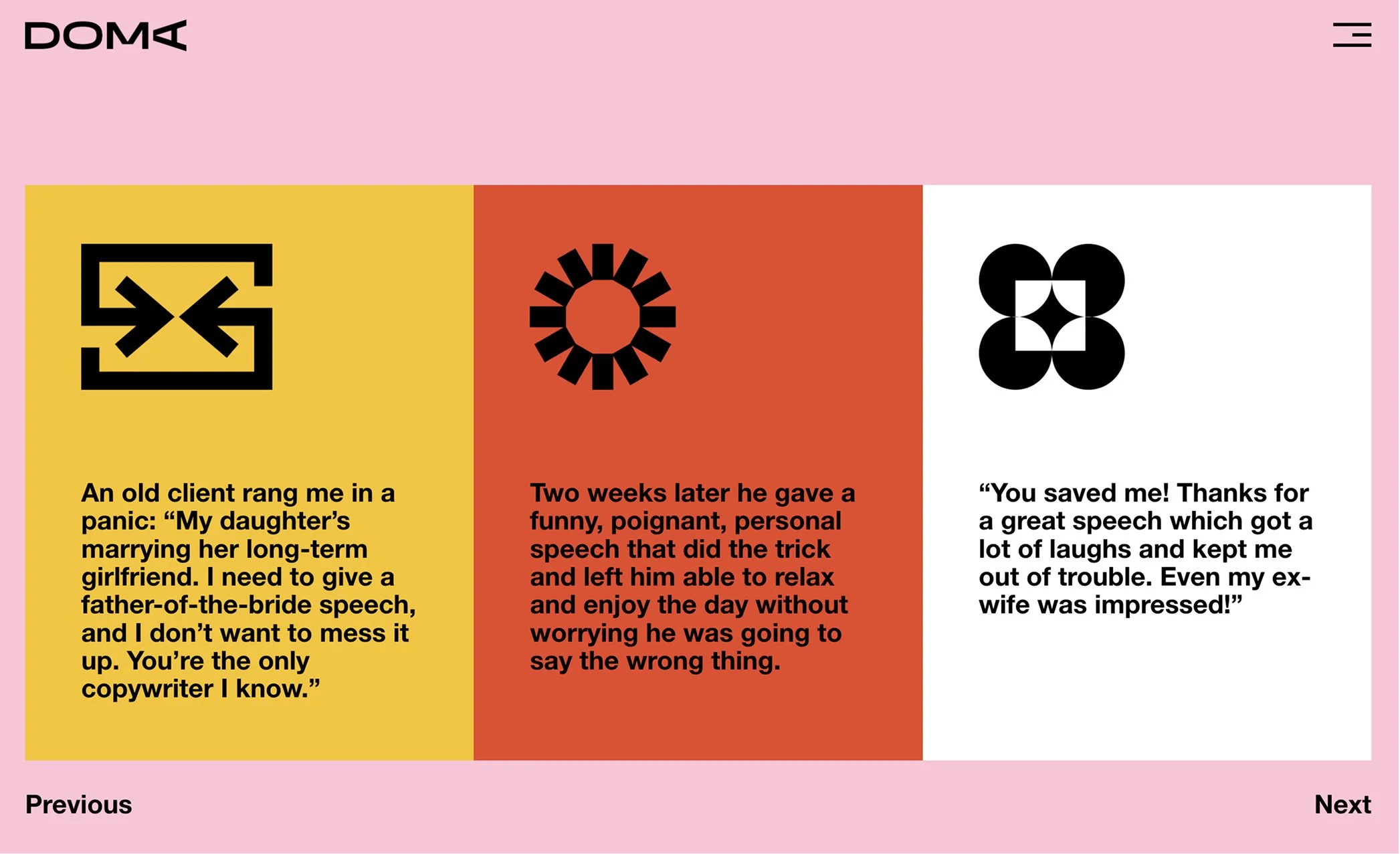 We scrutinised the suggested name DOMA Consulting and decided it's best to strip off "consulting". When you work with DOMA you work only with Dominique, and the journey you take with her is not the usual consulting engagement. The name itself is rooted in the personal: DOMinique Antarakis, which gave us a structural idea separating DOM from A. Toying with the A, we discovered it can be turned on its side, hinting at a megaphone. A light, quirky detail that stuck.