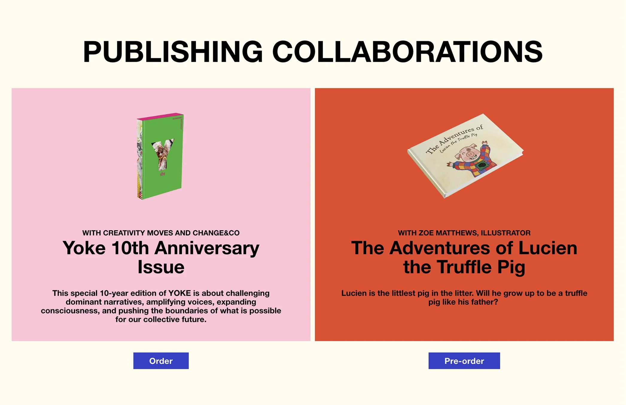 In interviews, we uncovered that Dominique didn't want to be contained in one definitive package. She is a multi-faceted creative personality with a wide range of interests, from writing children's books to organising large events to running fundraising workshops. These interests cannot be neatly packaged in one offering. They are scattered: and that is the point. Tapping into different worlds, she pulls insights and makes connections that allow her to find unconventional solutions.
