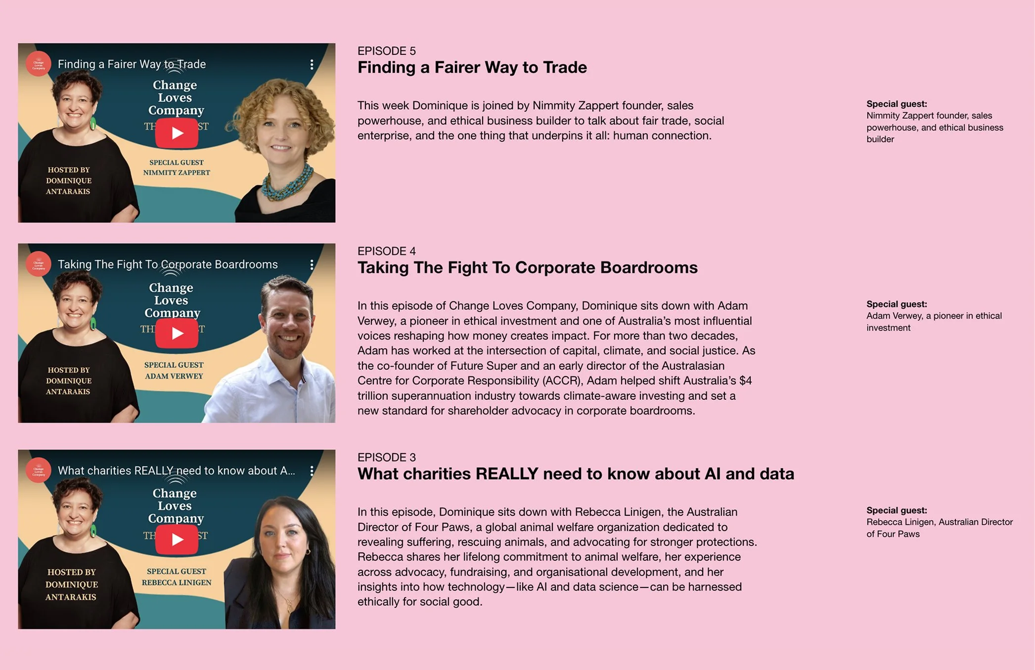 1. Intentionally scattered. We showcase the precedents of Dominique's practice as vignettes on the first screen. Scattered, but also ordered, working as a whole, forming a full landscape of her range. The TEDx work occupies the same visual field as a children's book and a charity rebrand. Each vignette shows a collaboration and its proof, not just Dominique's output.