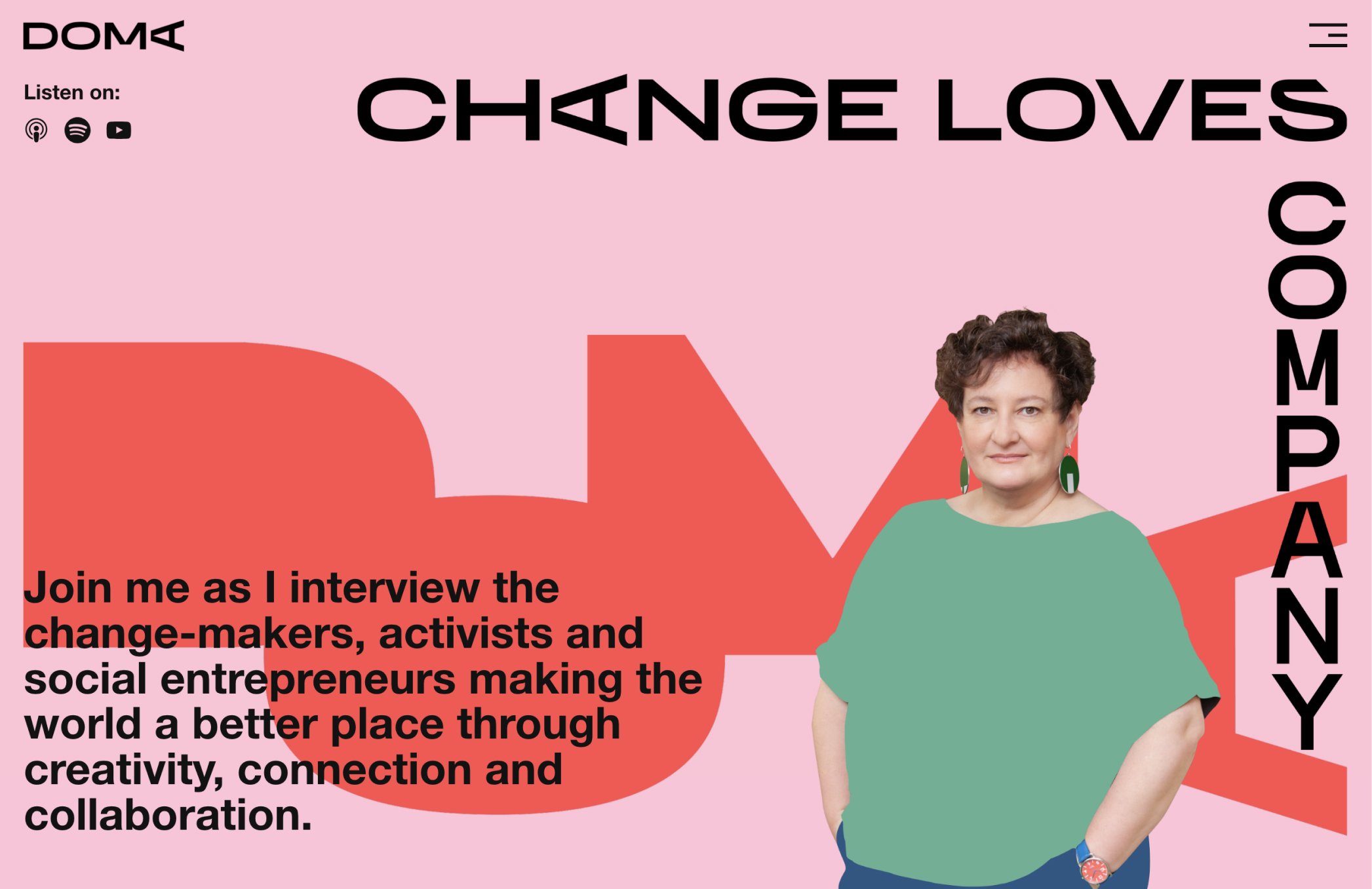 We developed the full brand package for Change Loves Company: logo, identity, episode graphics. BRRR sets the podcast title along two edges, horizontal and vertical, forming a frame corner. The DOMA letters sit in the background at massive scale, reading as graphic shapes before you notice they're letters. A quiet production signature. Dominique's photo is posterized into clean graphic form.