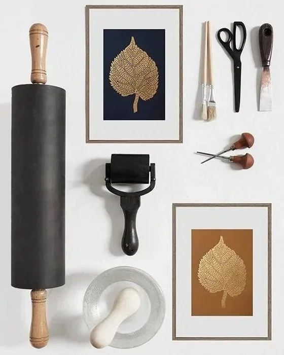 Today Monika works as a printmaker. Working on a large printing press she produces open and limited edition Lino Prints depicting large bold shapes like; a giant yellow lemon or a single gold leaf.