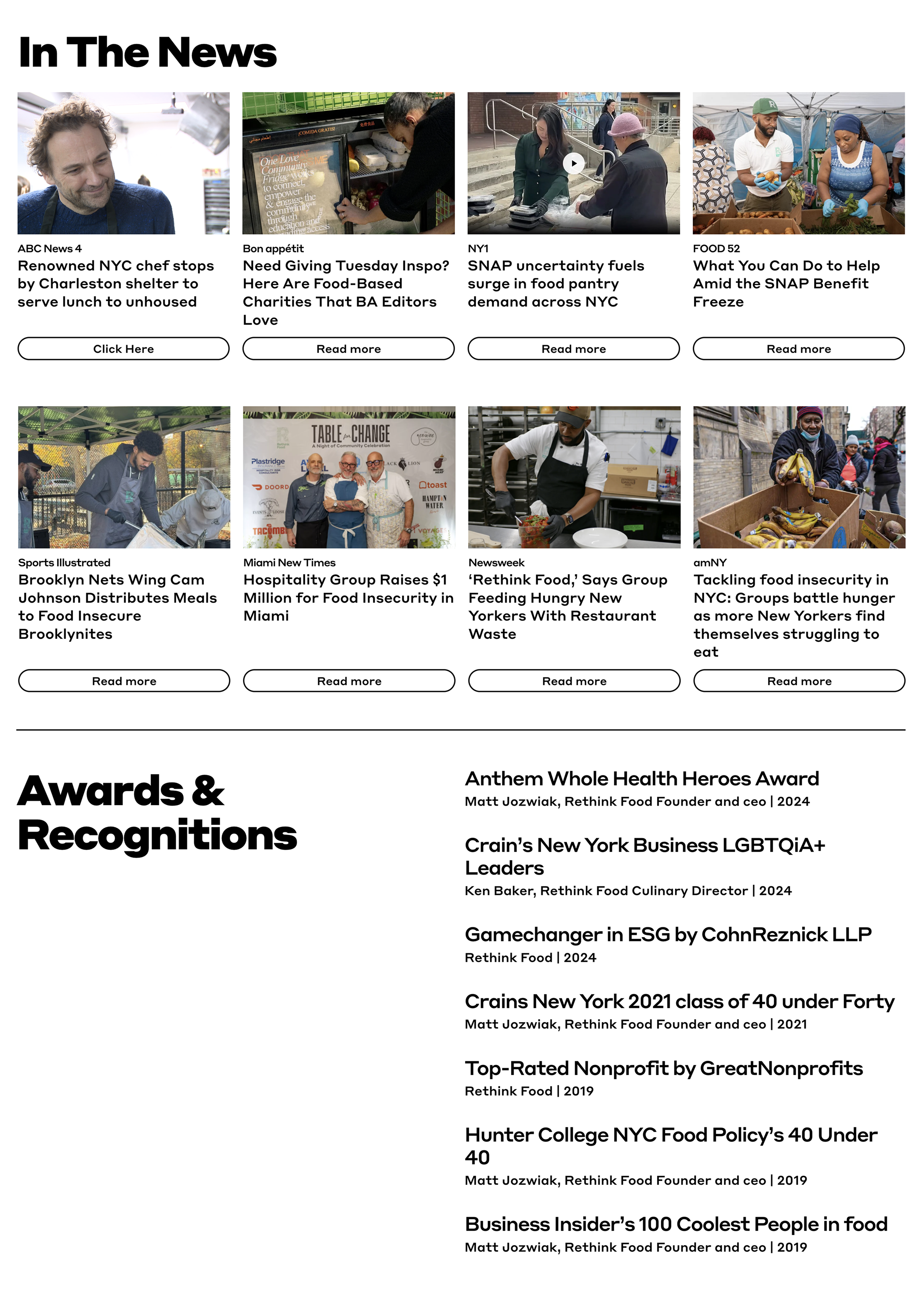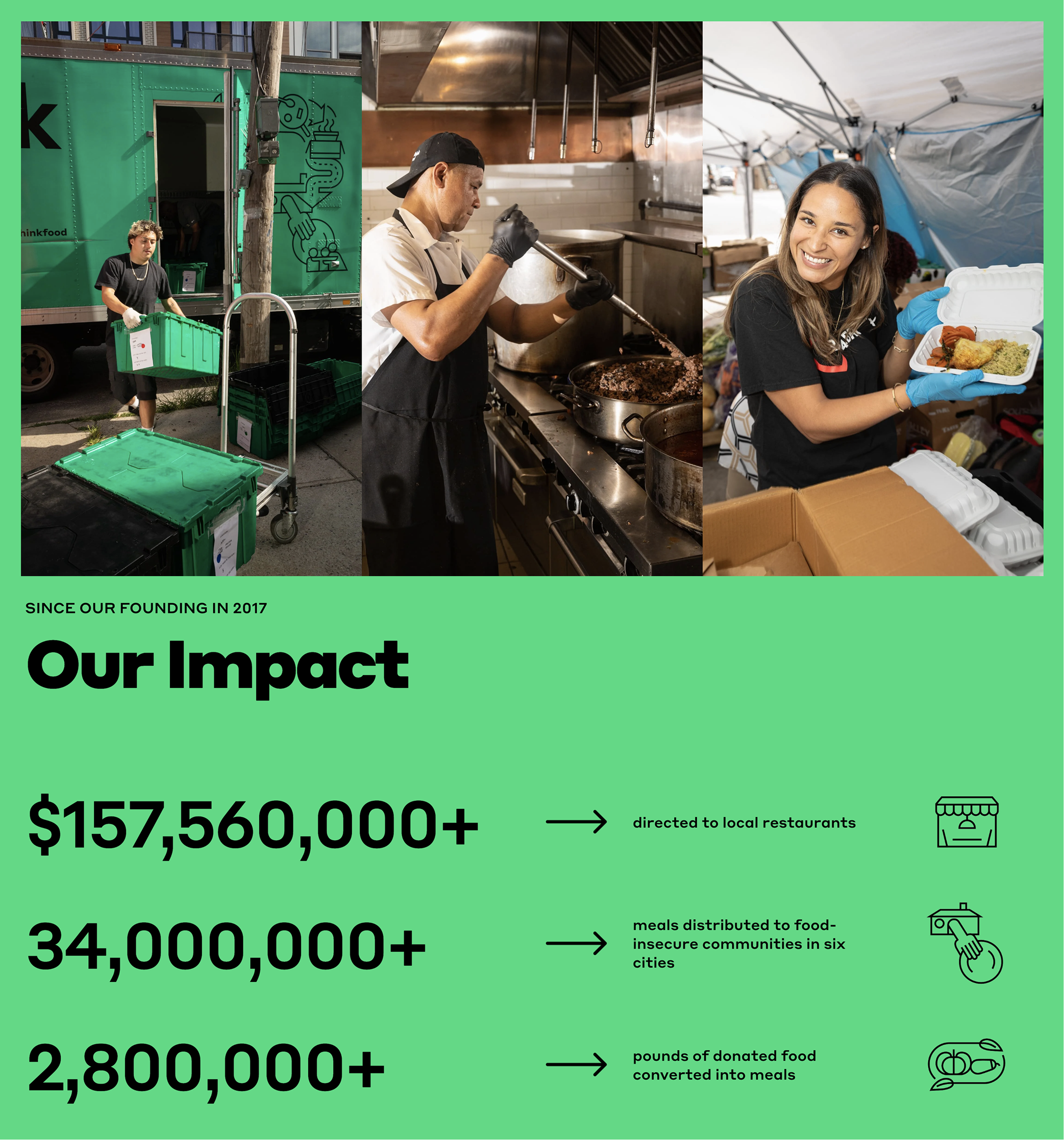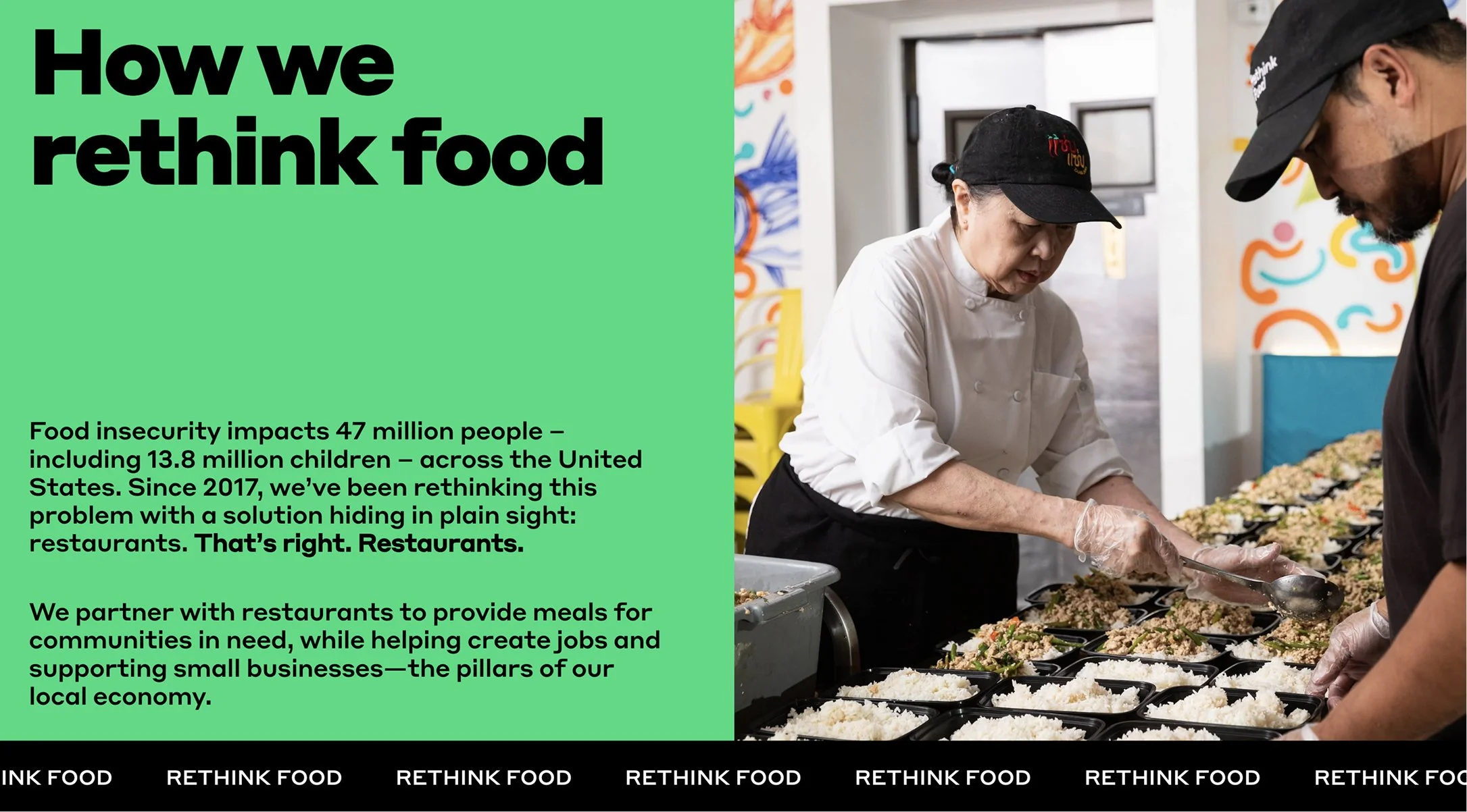 Rethink Food is a chef-led non-profit that connects restaurants with community organizations to deliver nutritious, high-quality, dignified meals where they're needed most. 34 million meals have been distributed since 2017.
