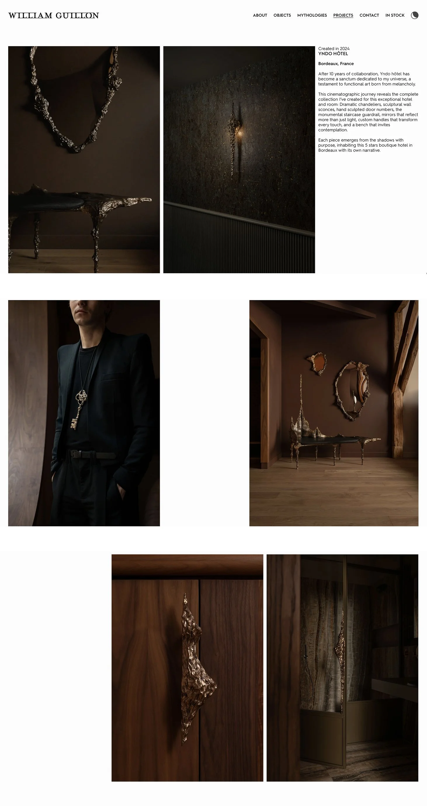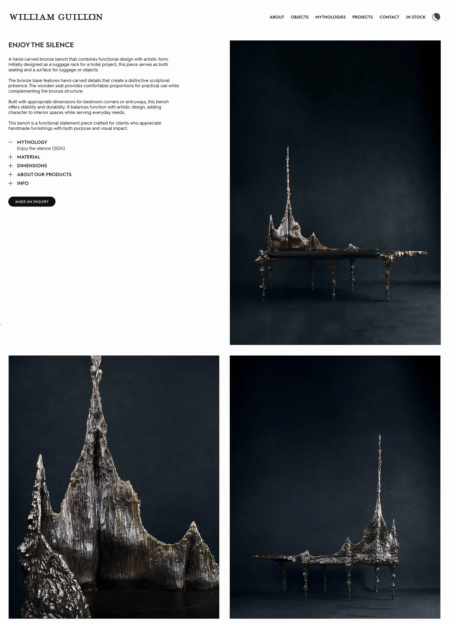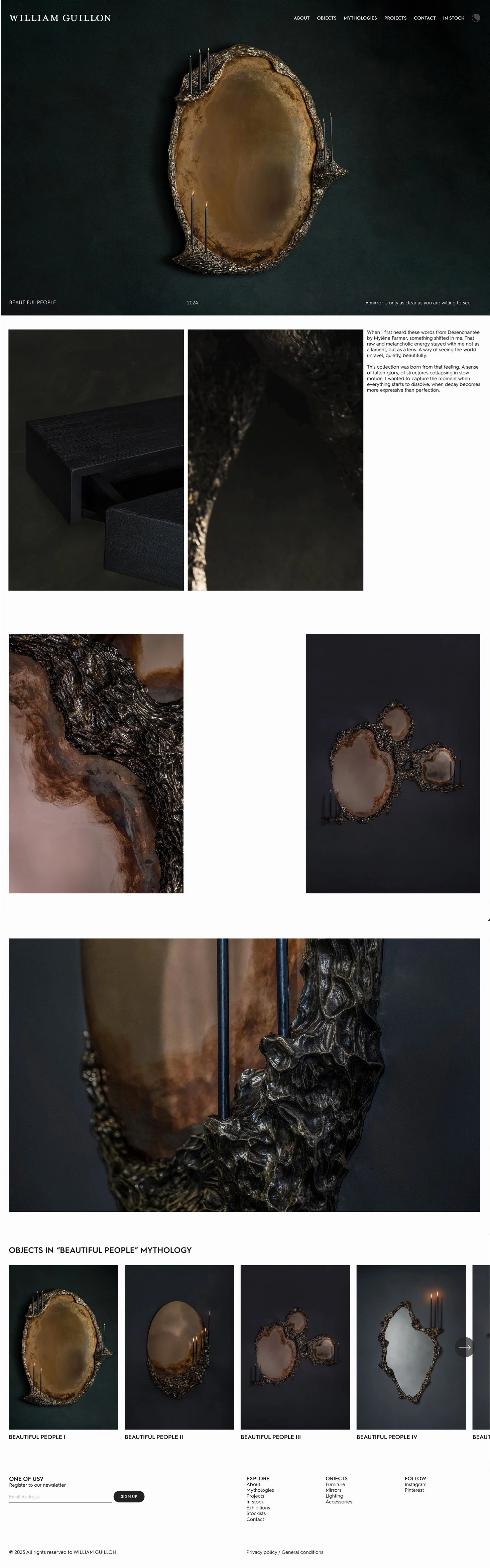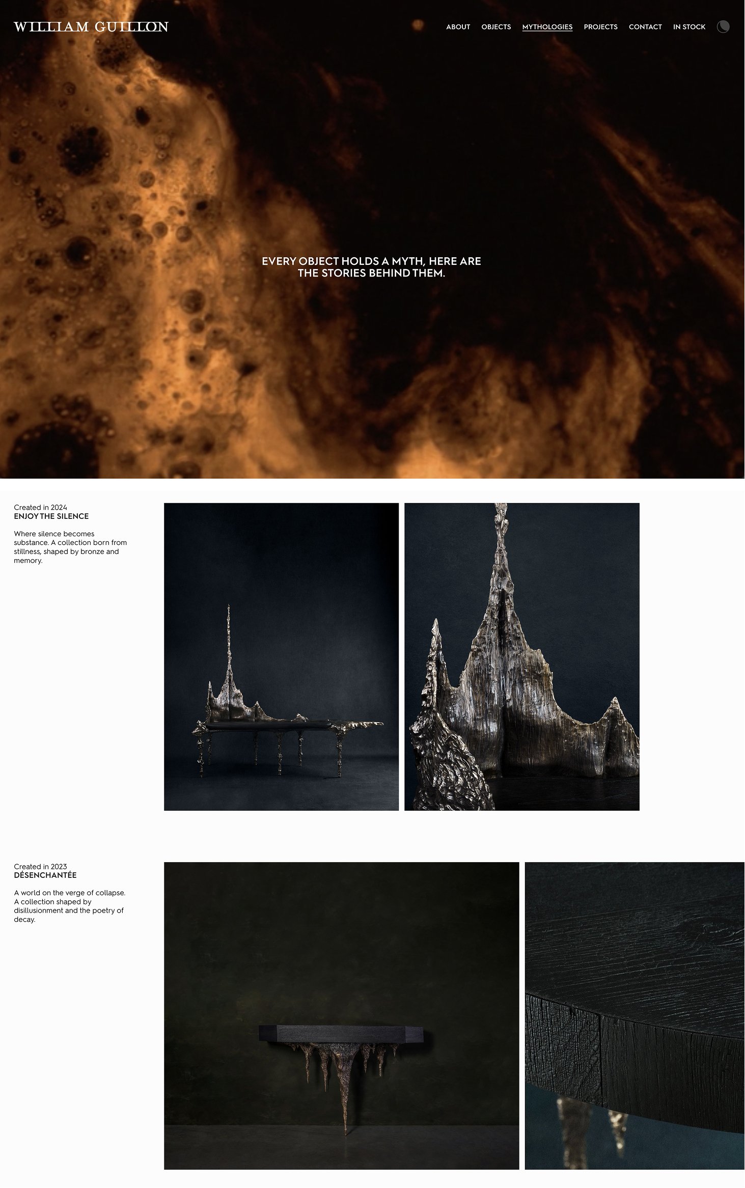 Two parallel tracks of exploration: "Mythologies" for exploring collections, and "Objects" to serve as a catalog, built for clarity and filtering. One track for storytelling, one track for finding, and deep interlinking between them. We highlight his collaborations and bespoke work, which are almost as important as the Mythologies. Every aspect of William's work is visible on the homepage, immersed in the metalwork footage.