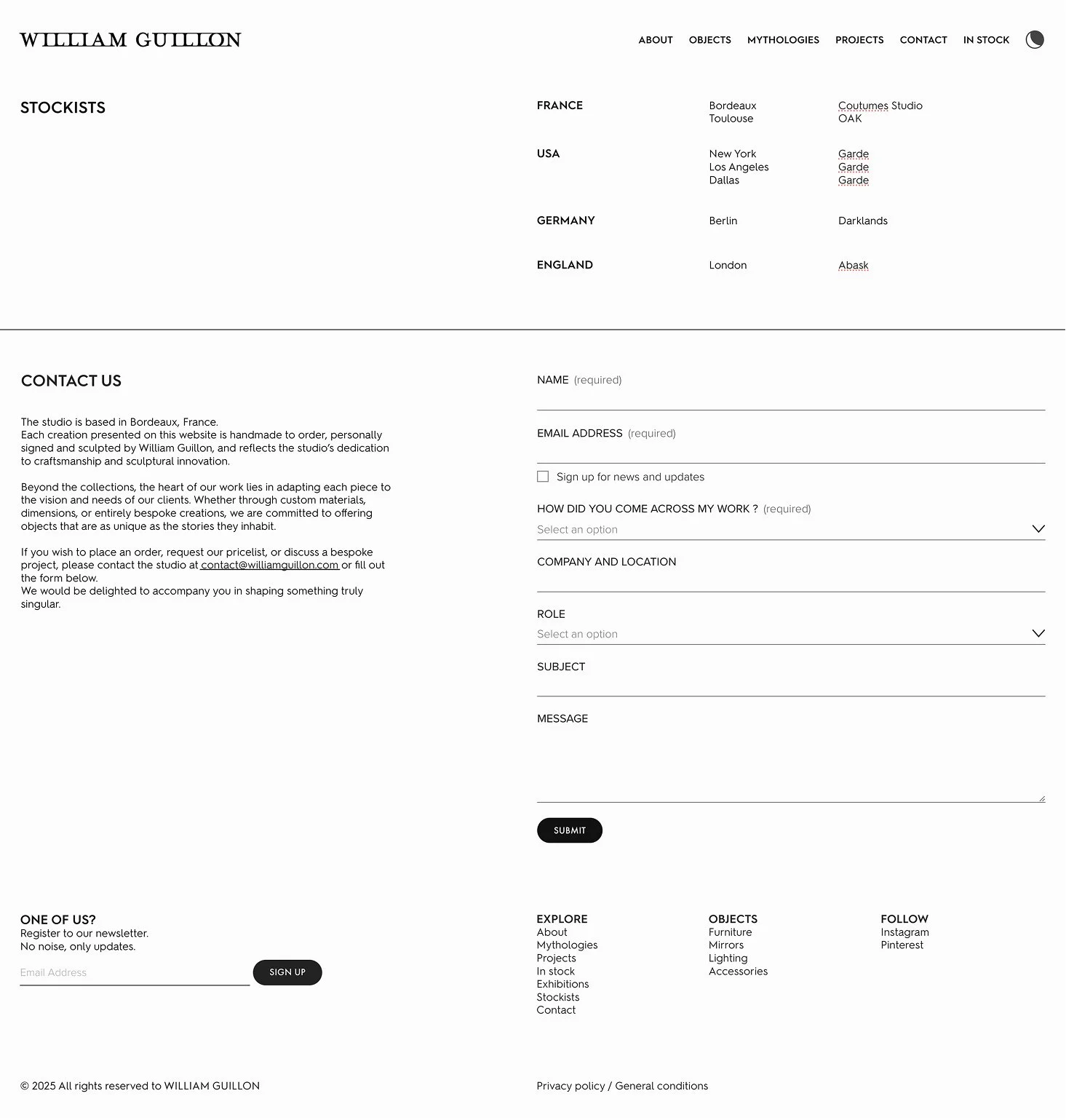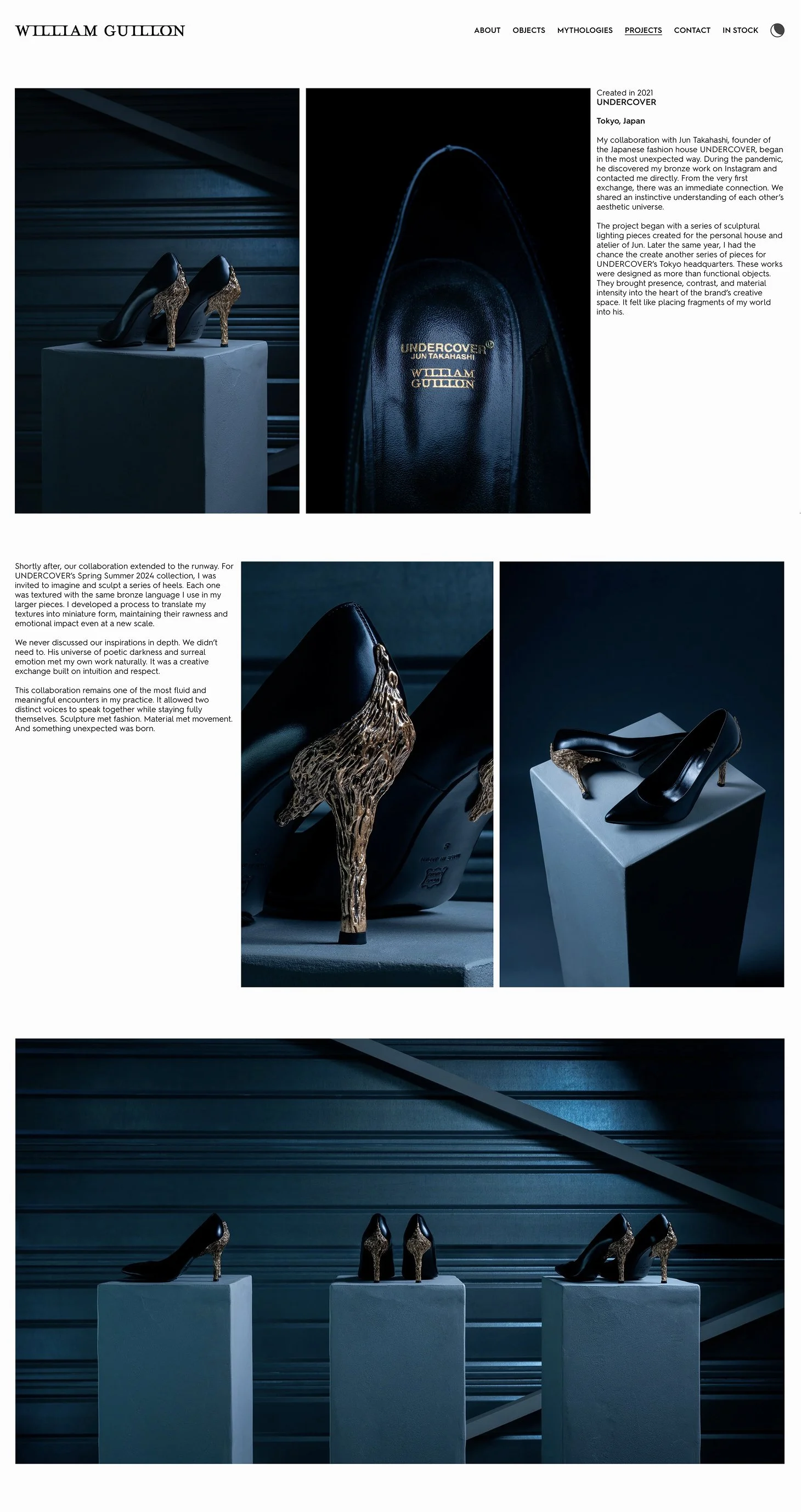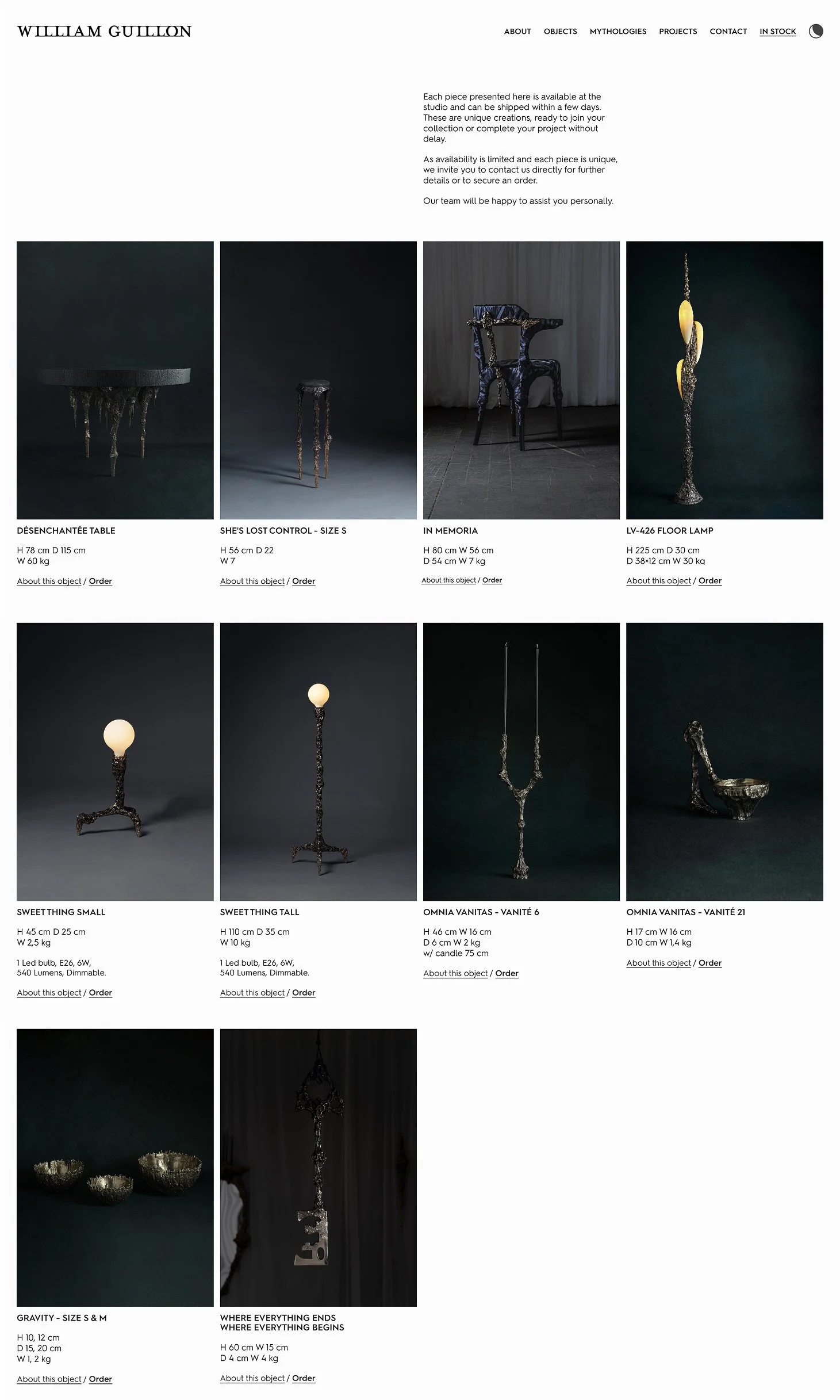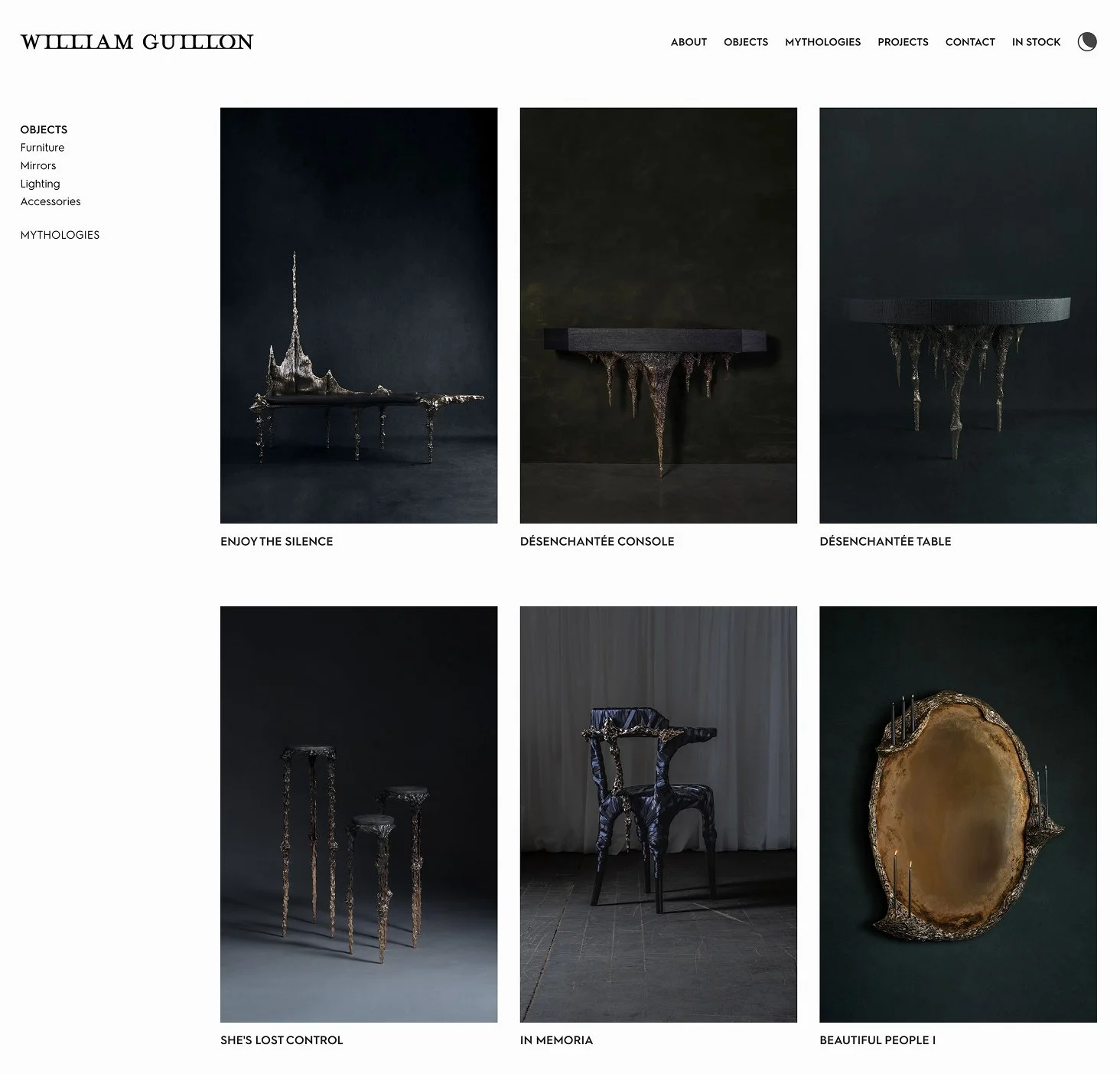 Two parallel tracks of exploration: "Mythologies" for exploring collections, and "Objects" to serve as a catalog, built for clarity and filtering. One track for storytelling, one track for finding, and deep interlinking between them. We highlight his collaborations and bespoke work, which are almost as important as the Mythologies. Every aspect of William's work is visible on the homepage, immersed in the metalwork footage.