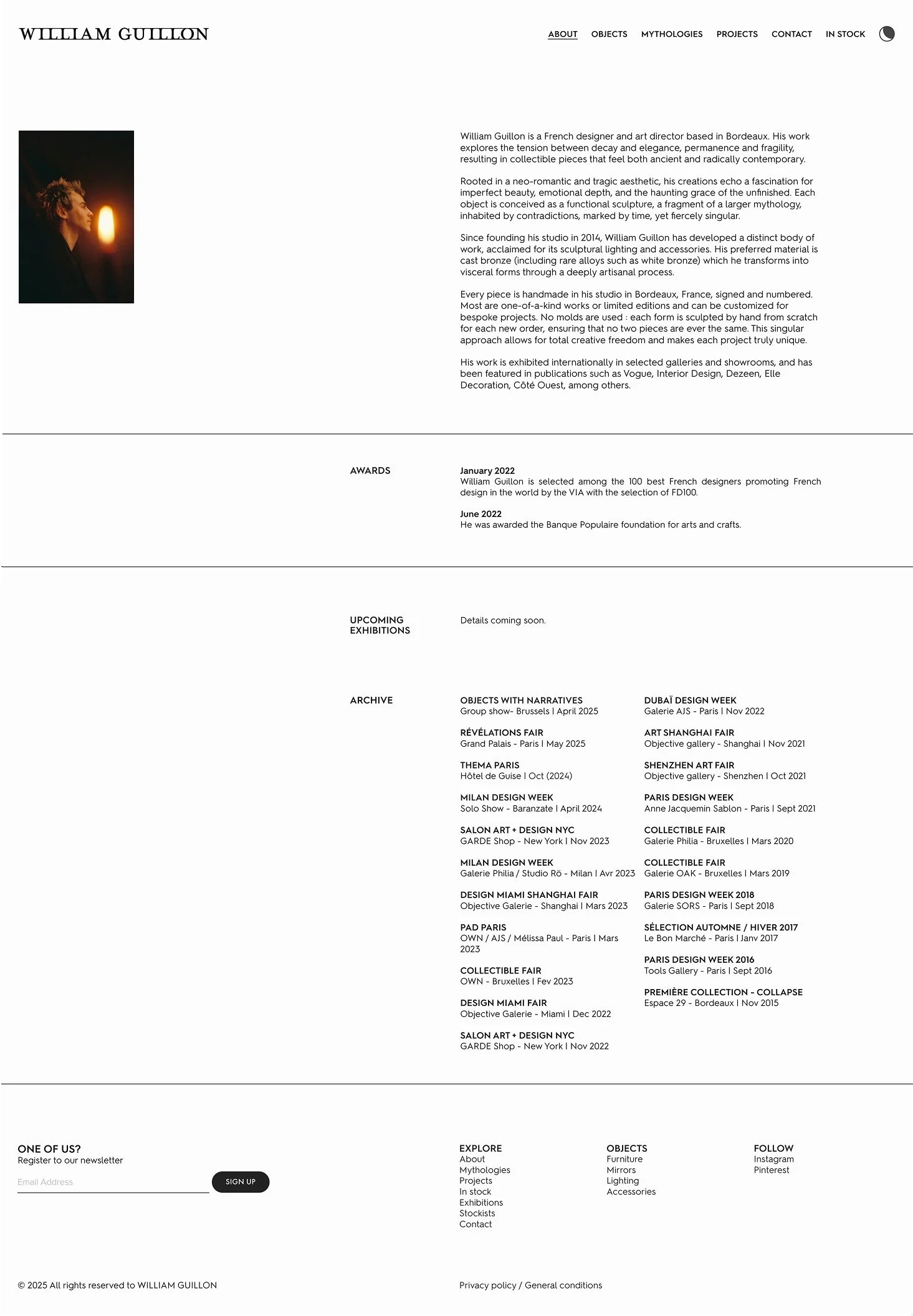 William Guillon is a bronze sculptor based in Bordeaux who makes collectable functional art: sculptural lighting and furniture cast in bronze. His work has been represented by top galleries and shown at PAD Paris, Design Miami, Collectible Fair Brussels, and Milan Design Week.